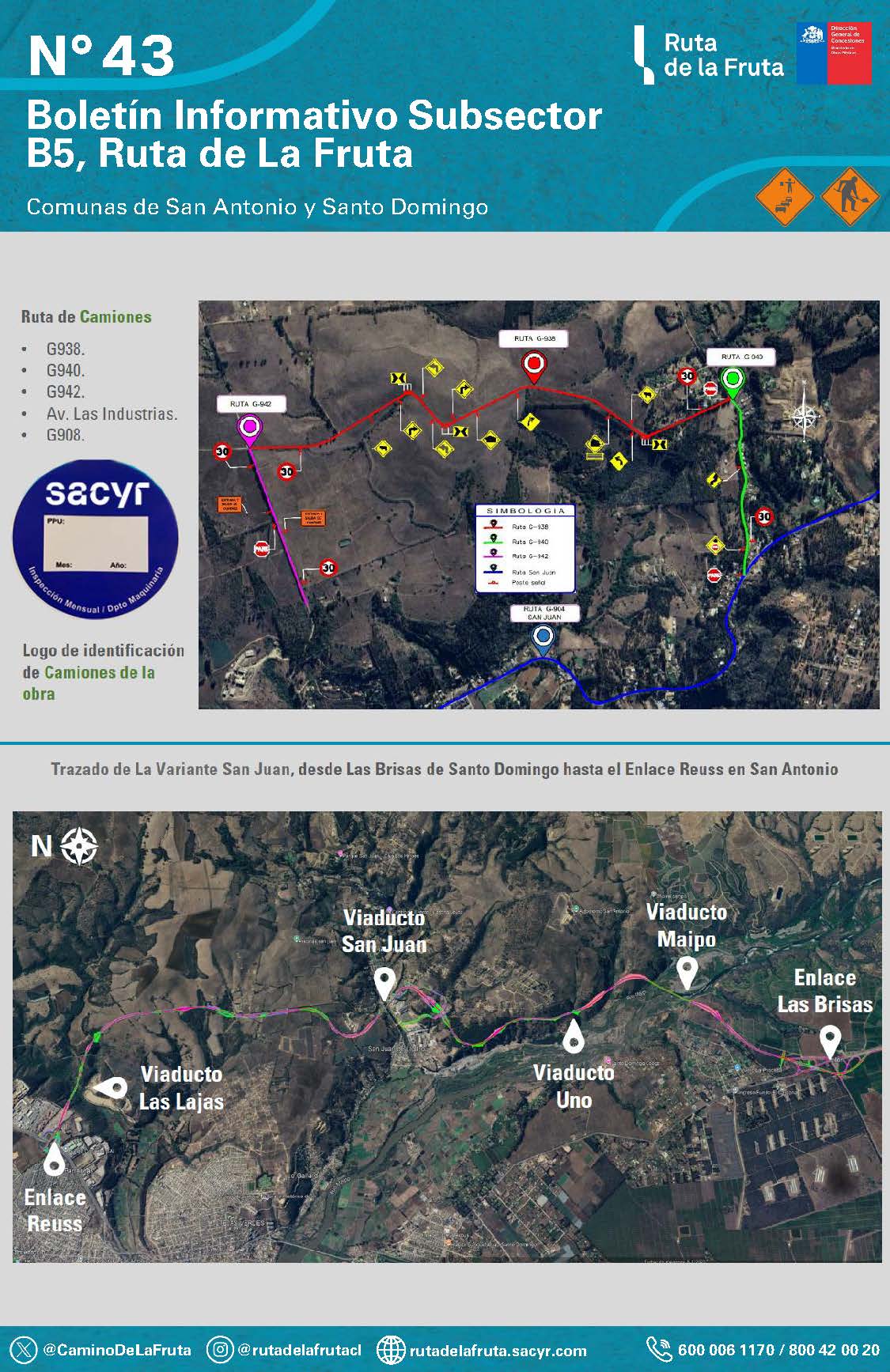 La Sociedad Concesionaria Ruta de La Fruta, informa a los vecinos de San Antonio y Santo Domingo que se seguirán desarrollando trabajos relacionados con la construcción del subsector B5 y plan de tronaduras controlada en el sector B5.2 y B5.3 de la variante San Juan.