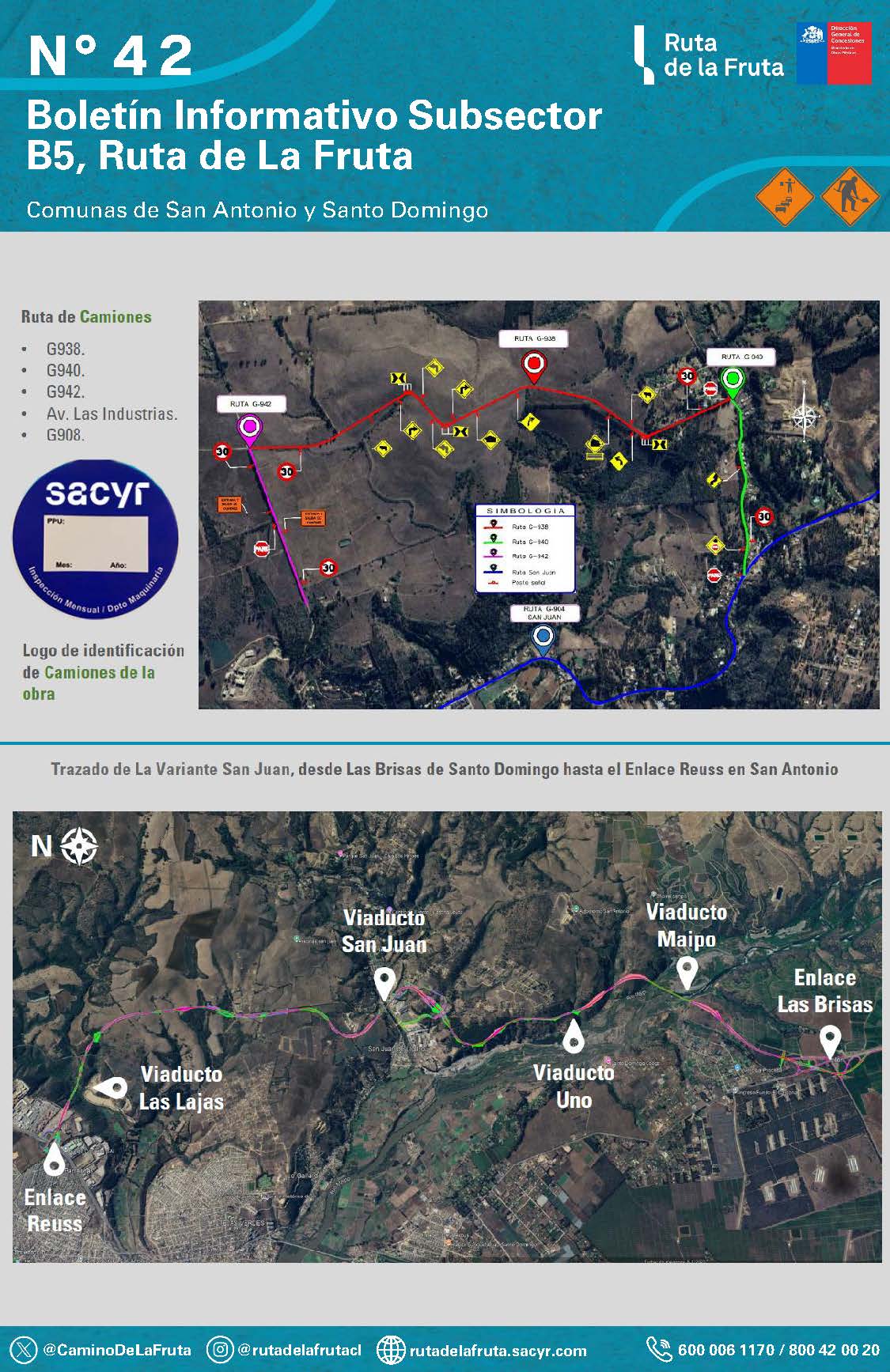 La Sociedad Concesionaria Ruta de La Fruta, informa a los vecinos de San Antonio y Santo Domingo que se seguirán desarrollando trabajos relacionados con la construcción del subsector B5 y plan de tronaduras controlada en el sector B5.2 y B5.3 de la variante San Juan.